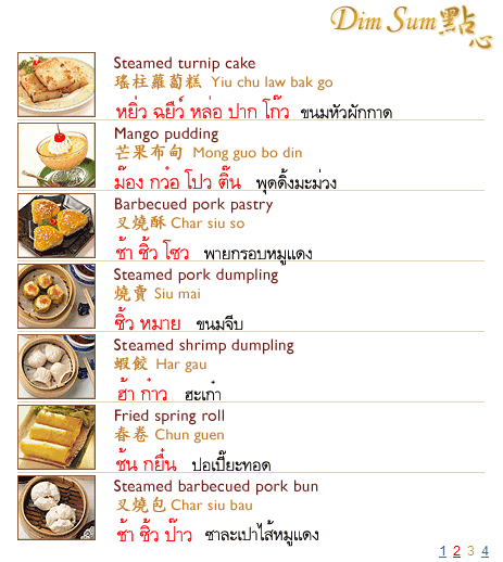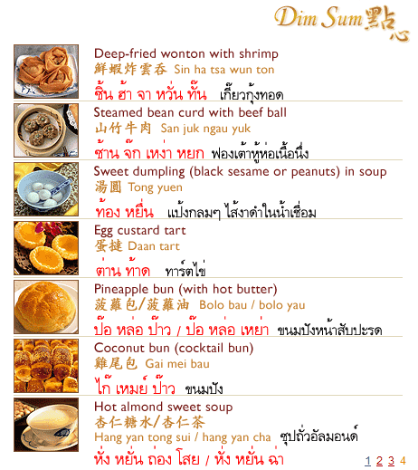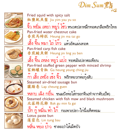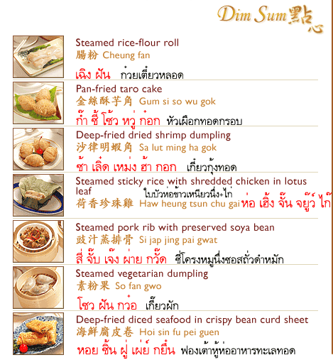 พอดีว่าเตรียมตัวจะไปฮ่องกงเหมือนกัน (ปีหน้า 54 นู้นนนน) ก็เลยเป็นห่วงเรื่องปากท้องตัวเอง กลัวจะสั่งอาหารไม่เป็นนอกจากเอานิ้วจิ้ม ๆ รูปและแอบดูชามคนอื่นเป็นวิธีหนึ่งแล้ว ก็อยากรู้ชื่ออาหารเขาบ้าง ก็เลยไป search ดูนู่นนี่เล่น ๆ ไปเจอใน web นี้คิดว่าคงจะเป็นประโยชน์บ้างไม่มากก็น้อย สำหรับผู้ที่อยากจะรู้ชื่ออาหาร เลยอยากจะเอาลิงค์นี้มาฝากเพื่อน ๆ บ้างค่ะ
