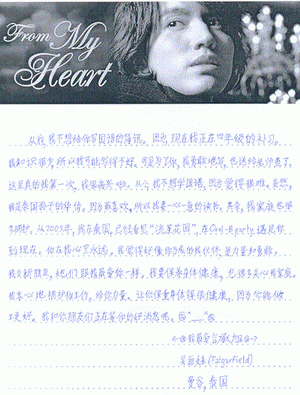 ....แต่ก่อน.... ฉันไม่คิดว่าจะได้เขียนข้อความสั้นเป็นภาษาจีนให้คุณ เพราะว่า, ตอนนี้ฉันกำลังเรียนพิเศษอยู่ชั้นป.4 ความรู้ของฉันน้อยมาก ดังนั้น ฉันอาจจะเขียนได้ไม่ดีนัก แต่ว่าเพื่อคุณแล้ว, ฉันกล้าที่จะเขียน, ส่งให้อาจารย์ตรวจทานแล้ว นี้เป็นครั้งแรกของฉันจริงๆ, ฉันดีใจมากหละ ตั้งแต่เด็ก, ฉันไม่คิดจะเรียนภาษาจีนกลาง, เพราะรู้สึกว่ายากมาก แม้ว่า,... ฉันเป็นลูกหลานของชาวจีนโพ้นทะเลในประเทศไทยก็ตาม เพราะว่า ชอบคุณที่สุด, ดังนั้น ฉันจึงตั้งใจเรียน นอกจากนี้, ครอบครัวของฉันก็สนับสนุนมากๆด้วย จากปี 2003, ฉันอยู่ที่ประเทศไทยได้ดู" หลิวซิงฮวาหยวน", ได้พบคุณที่งานOral-B, จนถึงปัจจุบัน คุณอยู่ในใจฉันเสมอ ฉันรู้สึกว่าเหมือนคุณเป็นเพื่อนสนิทของฉัน เป็นพลังและความกล้าหาญ ฉันได้พบเพื่อนใหม่, พวกเขาเหมือนกับฉันตรงที่ชอบคุณที่สุด ฉันจะดูแลรักษาสุขภาพให้แข็งแรง, แล้วเอาใจใส่ครอบครัวของฉันมากๆด้วย ฉันสนับสนุนผลงานของคุณอย่างจริงใจ, เป็นกำลังใจให้คุณด้วย ขอให้คุณรักษาสุขภาพให้แข็งแรง, เพราะว่าจะทำให้คุณสามารถทำงานได้ดียิ่งๆขึ้น ฉันและเพื่อนๆของคุณกำลังเฝ้ารอข่าวคราวดีๆของคุณอยูนะ@^___^@