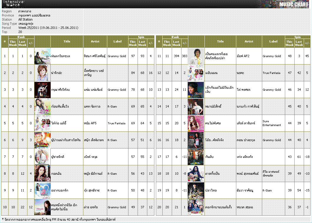 FM 88.5 ลูกทุ่งไทยแลนด์พลัส http://www.fm-885.com/main/index.php?option=com_k2&view=item&layout=item&id=80&Itemid=148 โทรศัพท์ 02-711-4885, SMS 4874885 อันดับชาร์จ วันอาทิตย์ เวลา 15:00น.