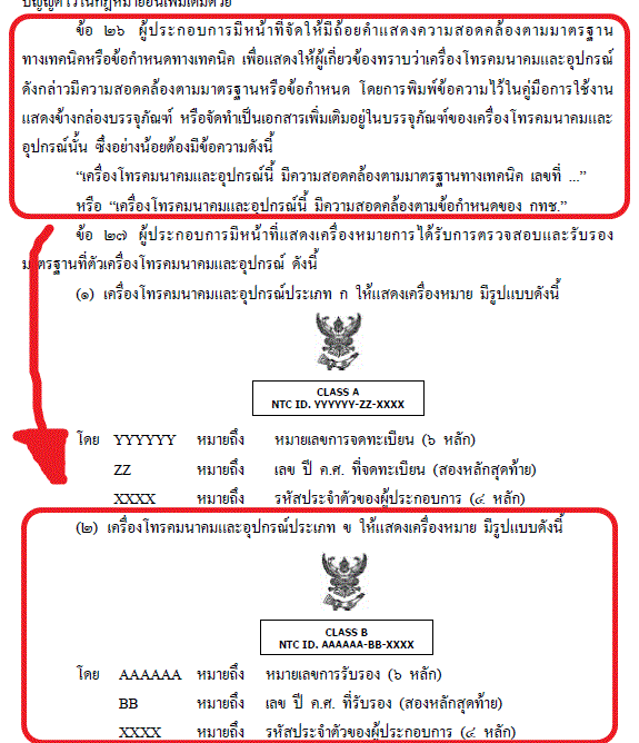 ส่วนนี่คือประกาศจากราชกิจจานุเบกษาครับ ว่า โทรศัพท์มือถือ Class B เป็นอุปกรณ์โทรคมนาคมระบบ Cellular (ก็คือมือถือที่คุณๆ ใช้อยู่นั่นแหละ) ซึ่งตามประกาศฯ จะเรียกว่าเป็น "ประเภท ข"