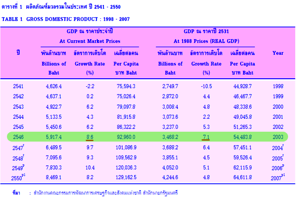 ? สำนักงานคณะกรรมการพัฒนาการเศรษฐกิจและสังคมแห่งชาติ (สศช.) ได้รายงานอัตราการขยายตัวของผลิตภัณฑ์มวลรวมในประเทศ (GDP) [/u]ไตรมาสที่ 3/2551 อยู่ที่ร้อยละ 4.0[/u] เมื่อเทียบกับช่วงเดียวกันของปีก่อนหน้า (Year-on-Year) ชะลอลงจากร้อยละ 5.3 ในไตรมาสที่ 2/2551 และหากพิจารณาถึงอัตราการขยายตัวเมื่อเทียบกับไตรมาสก่อนหน้า (Q-o-Q, Seasonally Adjusted) ชะลอลงมาอยู่ที่ร้อยละ 0.6 จากร้อยละ 0.8 ในไตรมาสที่ 2/2551 โดยอัตราการขยายตัว (Y-o-Y) ดังกล่าวต่ำกว่าคาดการณ์ทั้งของศูนย์วิจัยกสิกรไทยและค่าเฉลี่ยที่นักวิเคราะห์ส่วนใหญ่คาดไว้ที่ร้อยละ 4.3