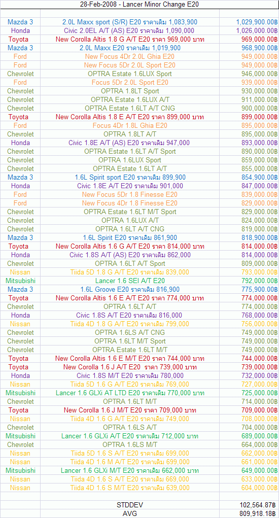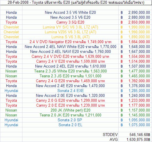 เท่าที่ผมจำได้ ตอนนี้ มีรถรุ่นเดิม (ไม่ใช่ออกรุ่นใหม่แบบเปลี่ยนโฉม) แต่ปรับสเปครองรับ E20 แล้วลดราคาเป็นเรื่องเป็นราว ก็มี - Nissan Tiida , Teana - Honda ทุกรุ่น ยกเว้น Jazz - Ford Focus กับ Mazda 3 --> 2 รุ่นนี้จริงๆ แล้ว รถที่ออกมาตั้งแต่หลายปีก่อน มันก็สเปค E20 อยู่แล้ว ดังนั้น ขอไม่พูดถึงแล้วกัน (จริงๆ แล้ว จำราคาไม่ได้เลยต่างหาก)