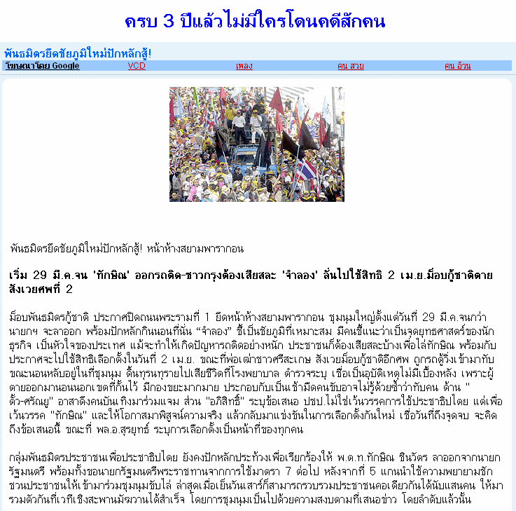 แต่ผู้ดูแลยังเห็นว่า เนื้อหาในกระทู้นี้บางท่านก็ใช้ข้อความที่ไม่สุภาพเกินไป เข้าประเด็นทางการเมืองเกินไป จึงข้อร้องให้ท่านสมาชิกอย่าใช้ข้อความรุนแรง หรือ แสดงความคิดเห็นทางการเมืองมากเกินไปในกระทู้นี้ มิฉะนั้นแล้ว ผู้แจ้งลบก็สามารถอ้างได้ว่า เป็นกระทู้ชวนทะเลาะ หรือเป็นกระทู้นอกเรื่องทางการเมืองซึ่งเรื่องแบบนี้ สมัยมีการยึดสนามบิน ชาว Blueplanet ก็สามารถแสดงความคิดเห็นได้อย่างไม่ต้องหยาบคาย และ ไม่พยายามเข้าเรื่องการเมือง มาแล้ว หากพบว่ามีข้อความในกระทู้นี้บางข้อความหายไป อาจเป็นไปได้ที่ผู้ดูแลเป็นผู้ลบเอง จึงเรียนมาเพื่อขอความร่วมมือจากสมาชิกห้องรัชดาทุกท่าน ประณามได้ แต่อย่าหยาบคาย ไม่เข้าเรื่องการเมือง ผมเชื่อว่าทุกท่านทำได้ ขอบคุณครับ จาก.. PANTIP.COM |